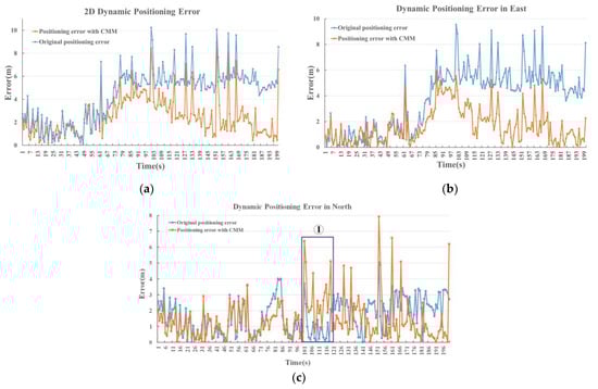 As shown in Figure 10, during the first 60 s, most of the data collected by the low-cost positioning system and M100 receiver are in the same lane. The results in Figure 10a show that the 2D original positioning error is mainly distributed within 3 m in the first 60 s, with an obvious decrease through CMM correction. After the first 60 s, due to the increase of the vehicle speed, the positioning accuracy is reduced, and the 2D positioning error range is mainly concentrated in 5–8 m, no more than 10.5 m. The dynamic positioning results imply that the positioning accuracy can be effectively improved with CMM correction.