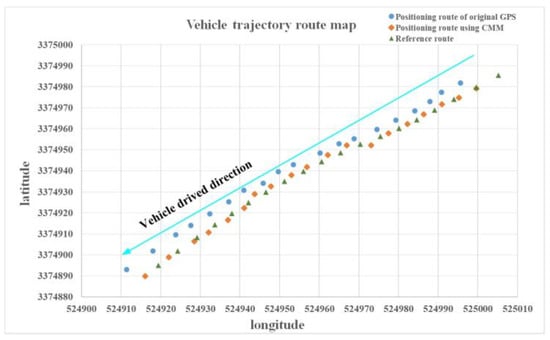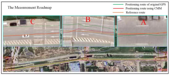 The trajectory map of the original GPS positioning, CMM correction positioning and reference positioning in the dynamic scenario is presented in Figure 13. From the roadmap, it can be seen more intuitively that in the test road, the positioning route using CMM is obviously close to the reference route, proving the effectiveness of the proposed method. In addition, the performance and reliability of the designed low-cost positioning system are tested and verified.