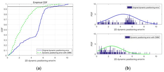 The CDF and PDF of the dynamic experimental results are shown in Figure 12. From Figure 12a, the error corresponding to the 95% confidence level is reduced from 8 m to 6 m through CMM correction. The PDF in Figure 12b indicates that most of the original dynamic positioning error is scattered within 6.5 m, mainly concentrated in 4–6.5 m. A small part of the positioning error ranges from 6.5 m to 10 m, and the maximum error does not exceed 11 m. In addition, by utilizing the CMM correction, it can be seen that most of the positioning error is distributed within 4 m. Some positioning error values are in the range of 6–8 m, and the maximum error is no more than 9 m.