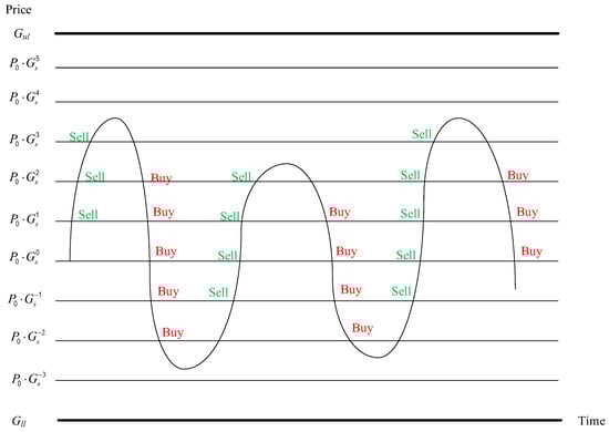 Before the grid trading model runs, the unit price difference Gs, which is the grid spacing, needs to be calculated using Equation (1) in Section 2 if the grid is an equal-distance grid. Gs is a certain value in equal-distance grid. However, it is a fixed ratio in equal-ratio grid, for example, the value of the next grid is = 110 and the next grid is = 121 when P0 = 100 and Gs = 1.1, and this ratio can be calculated from Equation (3) below.