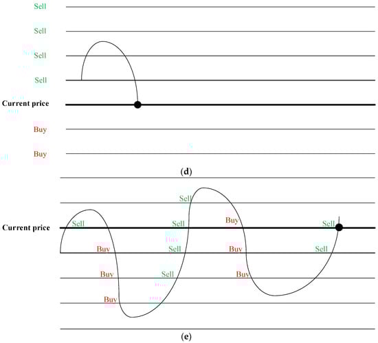 The following Figure 3a–e illustrate in detail how the grid trading model updates and adjusts with the market price after the initial parameters are set, and how to settle at the end.