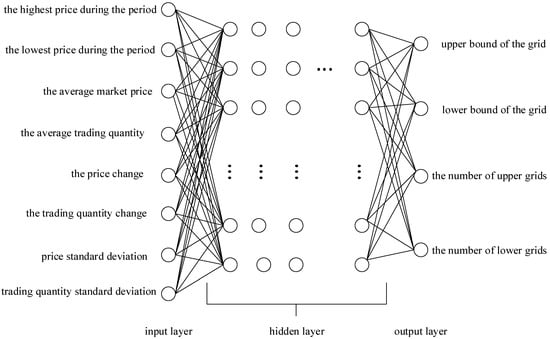 The input parameters are eight variables which describe a market situation: the highest price during the period, the lowest price during the period, the average market price, the average trading quantity, the price change, the trading quantity change, price standard deviation, and trading quantity standard deviation. In addition, the output variables are set to upper bound of the grid, lower bound of the grid, the number of upper grids, and the number of lower grids for grid trading.