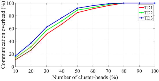 Percentage of the communication overhead with the change in the number of cluster heads, for different values of traffic density.