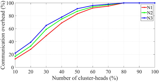 Percentage of the communication overhead with the change in the number of cluster heads, for different values of number of deployed vehicles.