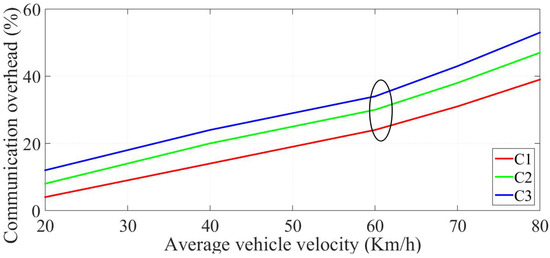 Percentage of the communication overhead with the change in the vehicle velocity.