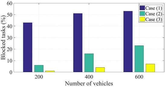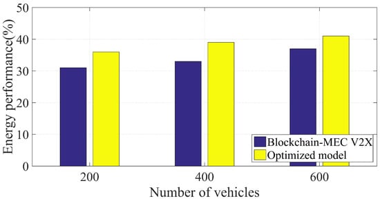 The percentage of blocked tasks compared to the total number of computing tasks was detected for the developed blockchain–MEC V2X system with the developed offloading scheme and for the optimized offloading scheme. Figure 6 provides the average percentage of blocked tasks for the three considered cases, for different values of number of vehicles. Each case represents a system; case (1) represents the system with local execution and no offloading scheme. The second case, case (2), represents the developed system with the developed offloading scheme, while the third case, case (3), was introduced for the developed system with the optimized offloading scheme. The optimized offloading scheme achieved the highest performance of task handling, even with the increase in the number of vehicles. Figure 7 provides the average percentage improvement of latency performance of the developed blockchain–MEC V2X compared with the traditional system, for three values of deployed vehicles. Moreover, the latency performance improvement of the optimized blockchain–MEC V2X is introduced in Figure 7. The optimized blockchain–MEC V2X achieved an average improvement of the latency performance of 39% compared with the traditional systems. The developed offloading scheme with blockchain–MEC V2X improved the energy efficiency of the system by reducing the energy consumption of task handling. Figure 8 provides the average percentage improvement of the energy performance for both systems, the blockchain–MEC V2X and the optimized blockchain-MEC V2X, compared with the traditional systems, for three values of deployed number of vehicles. The optimized blockchain–MEC V2X achieved an average improvement of energy efficiency of 36% compared to the traditional V2X systems.