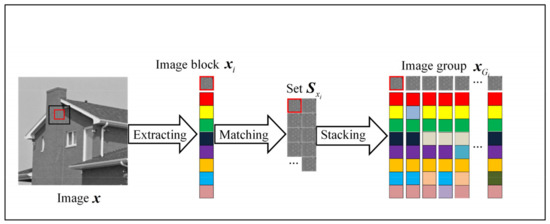 In this paper, image groups are sparse representation units for image processing. The following illustrates the image group construction and group sparse representation. Figure 1 depicts the image group construction. The initial image is divided into overlapped image blocks (red marked area). For each sample image block , similar image blocks are searched for in the search window (black marked area) to form the set . All elements in the set are converted into an image group by column. The construction of the image group can be simply expressed as , where means the extraction operation of the image group from the image.