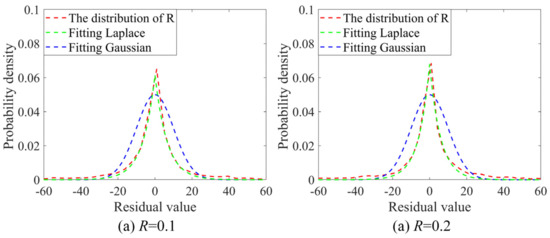 Figure 2 shows the distribution curves of the group sparse residuals of “House” at different sensing rates. It demonstrates that the Laplace distribution, as opposed to the Gaussian distribution, can better fit the group sparse residual distribution. As a result, the Laplace distribution approximates the statistical distribution of the group sparse residual. In other words, the norm constrains the group sparsity residual.