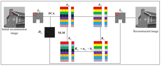 where the first term is a fidelity term, and the second term is a group sparse coefficient regularization term, which ensures the sparsity of the group sparse coefficients and reduces the complexity of the model with a regularization parameter . The third term is the group sparse residual regularization term, which improves the quality of the reconstructed image by increasing the prior information of the image, and the regularization parameter is . Figure 3 depicts the complete flowchart of the optimized GSR-JR model.
