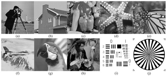 In this paper, extensive simulation experiments are conducted to validate the performance of the optimized GSR-JR model. Peak signal-to-noise ratio (PSNR) [33] and structural similarity (SSIM) [34] are used to evaluate the quality of the reconstructed image. The experiment uses ten standard images with the size of from the University of Southern California’s image library as the test image, as shown in Figure 4. All experimental simulation data are obtained by MATLAB R2020a simulation software on a Core i7-8565U 1.80 GHz computer with 4 GB RAM.