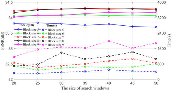 Based on previous studies [24,25,26,27,28,29], the PSNR and reconstruction time are discussed for image block sizes from 5 × 5 to 9 × 9 and search window sizes from 20 × 20 to 50 × 50. From Figure 5, it can be observed that the PSNR varies less under different search windows for the same image block size, which indicates that the search window has less influence on the reconstruction model quality. The large variation of PSNR for different image block sizes under the same search window indicates that the image block size has a large impact on the model. It can be found that the PSNR is higher when the image block size is 7 × 7 and 8 × 8, and the PSNR is highest when the search window is 35 × 35. It can be noticed that the image reconstruction time increases with the increase of image blocks. However, it is worth noting that there is a minimum value of reconstruction time for each image block at different search windows. This indicates that the image blocks and the search window are matched. This is the reason why we discuss image blocks and search windows together. Considering the model performance and time together, the image block size is set to 7 × 7, and the search window size is set to 35 × 35.