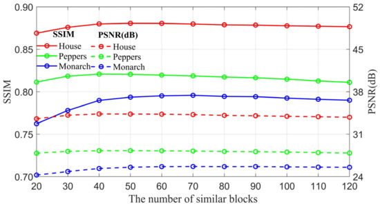 In Figure 6, the effect of the number of similar blocks in an image group on the reconstruction model is discussed. It can be observed that as the sensing rate increases, the SSIM and PSNR of the images first increase and then decrease. The reason may be that when the image group contains a few image blocks, similar image blocks are processed in the same image group, increasing the connection between image blocks and thus improving the image quality. However, when the image group contains a large number of image blocks, i.e., the blocks with low similarity are processed in multiple image groups, errors occur in recovering the average pixels of the image group. Considering the SSIM and PSNR of the three images, the quality of the reconstructed image is relatively better when the number of image blocks is 60. Therefore, the number of similar blocks is set to 60. Based on the above discussion, the size of the image block is set to 7 × 7, the search window is 35 × 35, and the number of similar image blocks is 60.