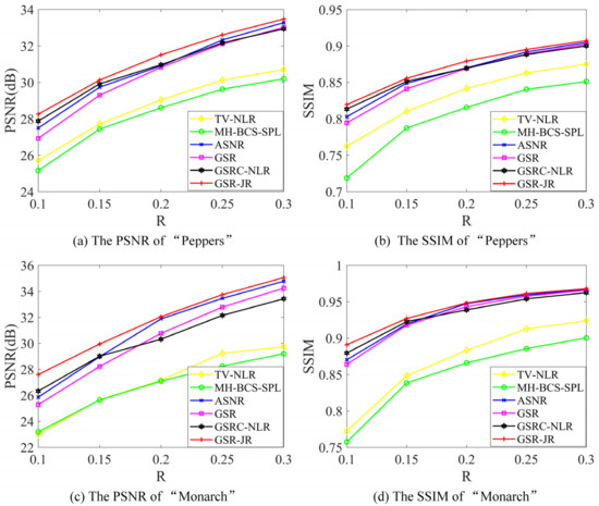Figure 7 shows the PSNR and SSIM of the six reconstructed models of “Peppers” and “Monarch” at different sensing rates. It can observe that the PSNR and SSIM increase gradually as the sensing rate increase, and the PSNR and SSIM of the proposed model are significantly higher than those of the other models. In the PSNR images of Figure 7a,c, it can be concluded that the PSNR growth rate of different models changes when the sensing rate is 0.2. The PSNR of the ASNR model increases significantly, the GSRC-NLR model increases slowly, and the PSNR of the proposed GSRC-JR model increases steadily.