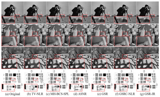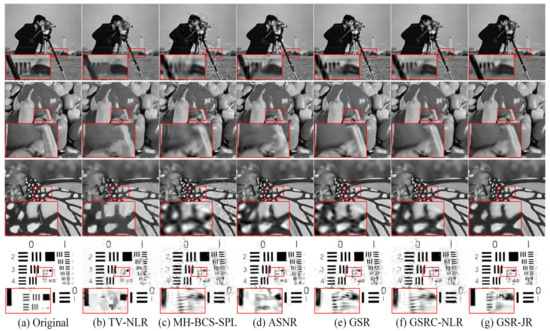 Figure 8 shows the visual effect of the reconstructed image when the sensing rate is 0.1. It can observe that the reconstructed images of the TV-NLR model are severely blurred, and the contour boundaries and texture details of the images are hardly identified. The reconstructed images of the MH-BCS-SPL model can only identify the contours of the “Peppers” and “Monarch” images among the four images. The ASNR model also has a significant blurring effect on the reconstructed images, which is mainly around the image details. In the GSR model, although the “Monarch” still has unidentifiable artifacts, the stem of “Peppers” and the horizontal lines in the “Resolution chart” are identifiable. The GSRC-NLR model reconstructs the images visually well, although there are still some artifacts. Compared with the other models, the proposed GSR-JR model reconstructs the images with the best visual effect even though there are also artifacts, and the details of the images are easier to identify when comparing the magnified areas of the four images.