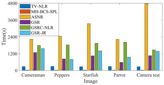 Reconstruction time is also an important metric for evaluating image reconstruction models. The reconstruction times of the six image reconstruction models are analyzed in Figure 10. From the figure, it can be observed that the TV-NLR and MH-BCS-SPL models take relatively less time, but the quality of the reconstructed images is also worse. The optimized GSR-JR model takes less time than the ASNR model, though the reconstructed image is comparable. The proposed GSR-JR model combines the group sparse residual regularization constraint, so the reconstruction time is slightly higher than that of the GSR model. The reconstruction time is less than that of the GSRC-NLR model, owing to the group sparse coefficient regularization constraint. Considering the reconstruction quality and reconstruction time together, the proposed GSR-JR model is more practical. Meanwhile, it can be found that although the reconstruction time of the GSR-JR model is better than other reconstruction models based on image groups, it cannot achieve real-time image reconstruction, which is the limitation of the reconstruction model, and how to further reduce the reconstruction time of the model and achieve real-time image reconstruction is the direction that the model will continue to work on.