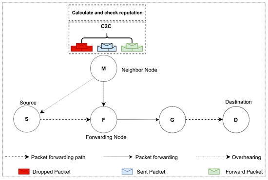 Illustration of the proposed scheme, where nodes monitor the C2C of other nodes and calculate the reputation accordingly.