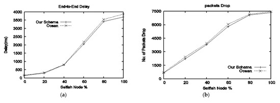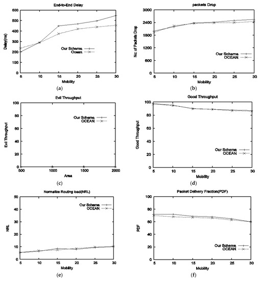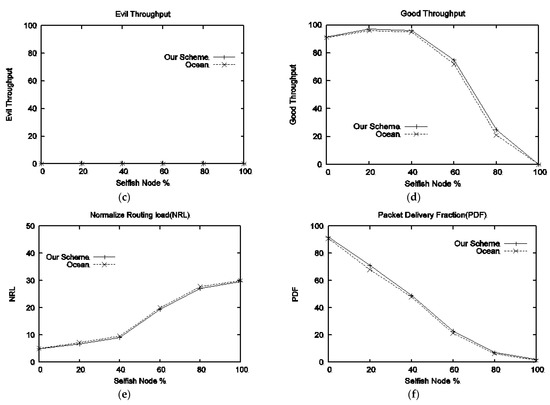 Results of both schemes in terms of delay, packet drop, evil throughput, good throughput, NRL, and PDF against the different percentages of selfish attackers are shown in Figure 7a–f. End-to-end delay is presented in Figure 7a; our scheme produces a minimal delay as compared to OCEAN. Packet drop is given in Figure 7b; a small amount of packet drop can be observed in our scheme throughout all selfish percentages, as our scheme does not allow a selfish node again once detected, while OCEAN gives a second chance to selfish nodes to participate in the network. Figure 7c represents evil throughput; both schemes show a zero evil throughput, as nodes do not take part in the REEQ and RREP phase. Figure 7d represents good throughput; it can be observed that our scheme performs better than OCEAN in the presence of selfish percentage ranging from 0% to 100%. NRL is presented in Figure 7e; NRL produced by our scheme is less than OCEAN along with all selfish percentages. PDF is shown in Figure 7f; it can be witnessed that our scheme outperforms OCEAN in terms of PDF.