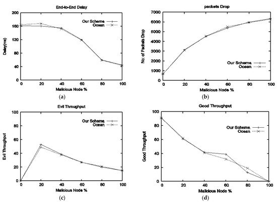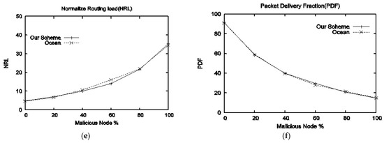 Both schemes are investigated under various percentages of malicious nodes. The behavior of both schemes in terms of delay, packet drop, evil throughput, good throughput, NRL, and PDF is shown in Figure 6a–f. End-to-end delay is presented in Figure 6a; small delay of our scheme can be observed in the presence of 50% malicious nodes, however, with an increase in malicious percentage same behavior of both schemes can be observed. Packet drop is presented in Figure 6b; OCEAN leads to high packet drop in comparison with our scheme, as malicious node(s) once again join the network using the second-chance mechanism. Figure 6c shows the throughput available to evil nodes; however, our scheme performs well as the malicious percentage increases. The throughput provided to good nodes by both schemes is given in Figure 6d; our scheme is better than OCEAN, particularly with a 60% malicious percentage. NRL is presented in Figure 6e; as the malicious percentage is above 50%, our scheme NRL decreases; however, the same behavior of both schemes can be observed when the malicious percentage is below 50%. Packet delivery fraction is given in Figure 6f; both schemes delivered the same overall malicious packets percentage.