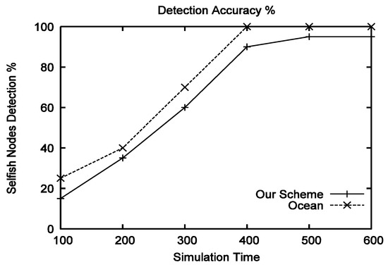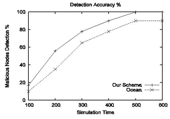 The detection accuracy of our scheme and OCEAN for different simulation times is shown in Figure 8. As compared to OCEAN, our scheme detects all malicious nodes within less time because OCEAN cannot detect such nodes that partially drop some packets to sustain its reputation threshold. In detection accuracy, our scheme outperforms OCEAN and isolates malicious nodes from the network within the shortest time.