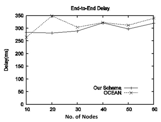 To assess the scalability of the proposed scheme, different numbers of nodes are used. The selfish population is fixed at 20% and the speed is kept at 15 m/s. Figure 10 shows the end-to-end delay versus the number of nodes. It is evident that our proposed algorithm performs similarly regardless of the number of nodes and reports less delay as compared to the benchmark scheme. It is worth noting that the selfish nodes continuously change their position (location), but our scheme can effectively locate these nodes and isolate them from the network quickly. As a result, the nodes can quickly reconstruct the route and communicate within a controlled delay. In contrast, when nodes in OCEAN change location, every time they appear as new nodes they will utilize network resources until they are detected. As a result, it can be concluded that the proposed scheme can scale to networks with a large number of users.