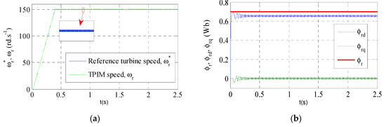 Simulation results of IRFOC no-loaded TPIM drive fed by an advanced SVM controlled 2ϕ-inverter under linear constant wind speed profile: (a) turbine and TPIM speeds; (b) rotor fluxes; (c) reference and TPIM electromagnetic torques; (d) d-axis reference and actual stator currents and (e) q-axis reference and actual stator currents.