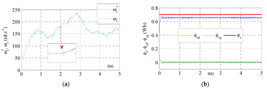 As a first test, a linear constant wind turbine speed variation is applied to the TPIM model as a reference to observe WTE behavior and to validate the waveforms obtained from the whole system, taking into account the advanced SVM technique and the IRFOC strategy. Simulation results are illustrated in Figure 11. Figure 11a presents the speed waveforms, Figure 11b presents the flux waveforms, Figure 11c presents the torque waveforms, Figure 11d presents the d-axis current waveforms and Figure 11e presents the q-axis current waveforms.