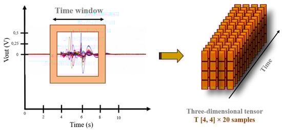 The collected touch modalities were represented by a tensor of three dimensions (4 × 4 sensor array and time) of size T (4 × 4 × 30,000). The third component of the tensor T was determined by a time interval of (10 s) in each experiment with an adopted sample rate of (3 k samples per second). Pre-processing is used to remap the original tensor mostly to reduce the dimensionality of the third component of T. Only a portion of the 30,000 samples in the third component of T carry information about the tactile stimulus. The relevant signal lies in a limited time window as shown in Figure 3. The localization of the relevant time window is defined after evaluating the amount of energy provided by the sensors as proposed in [4]. In the following, the tensor t obtained after extracting the relevant time window from T is as follows: t (4 × 4 × 20).