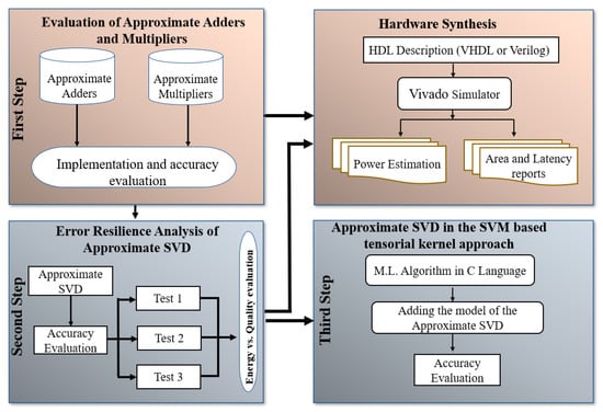 In recent years, approximate computing techniques (ACTs) have attracted much research since they may enhance the energy efficiency of embedded digital systems. ACTs target error-resilient applications to trade accuracy for power consumption, time latency, and hardware size [11,12]. Approximate computations are effective in many applications, e.g., image processing [13], data mining [14], and tactile data processing [15], where there is a possibility to take advantage of energy reduction with minimal loss of accuracy [16]. ACTs could be considered as a potential solution to reduce the computational cost of our targeted SVD implementation in the tensorial kernel approach. In this perspective, this paper aims to answer the following questions: