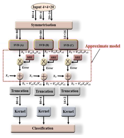 The goal of the third test is to figure out the range of the maximum error that could be generated from the approximate SVD. The tensorial kernel algorithm is modeled in the C language in the third step. The approximate SVD model is introduced in the simulation program as shown in Figure 5. We test the impact of the approximate SVD on the accuracy of the classification. The MRE generated from the approximate SVD from each of the three tests done above (test 1, test 2, and test 3) is added to the simulation program. The MRE is applied through element-wise multiplication with the eigenvectors of the SVD, as follow: