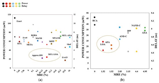 Power Consumption [mW], delay [10−9 s], and MRE of (a) approximate adder and (b) approximate multiplier circuits.