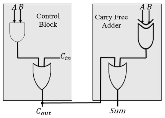Seven relevant approximate multipliers from the state-of-the-art [20,21,51] including two approximate multipliers proposed in our recent work [20], Reference [22] have been selected for the analysis. META [22] multiplier is a rounding multiplier based on the Error tolerant Adder (ETA). Approx-BW multiplier [20] is based on dividing the circuit architecture into two parts: accurate and approximate, as shown in Figure 7. From right to left, an exact addition is computed in the accurate part. Through a half adder, the partial products are added; the generated carry signal is propagated to the following partial column in the next column. The partial products in the second column are computed through the Ripple Carry Adder (RCA). While in the approximate part, the addition of the partial products is done through the AFA approximate adder [20]. Starting from the first column on the left, an input carry signal set to “0” is added to the first partial product. Then, in each column the values of the partial products are checked through the AFA [20] adder, which consists of two blocks: control block and carry free adder block as shown in Figure 8. The control block applies an AND logic operation for the two input bits A and B. Then, the result performs an OR operation with the control signal obtained from the previous control block. While the carry-free adder block is composed of an XOR and OR gates generating a sum bit based on a control signal obtained from the control block. As shown in Table 2, if all the values of the partial products are 0, or if one partial product is equal to 1, a normal addition is computed. Otherwise, if two partial products or more are equal to 1, then the sum of the partial products in the selected column and all the remaining right columns is set to 1. The approximation strategy adopted is inspired by the approach employed in [50]; where the control check approach has achieved good improvements in the Error Tolerant Adder (ETA). Therefore, we have applied this approach to the approximate multiplier.