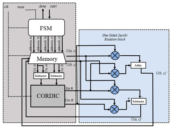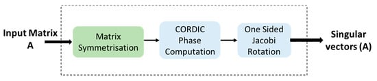Figure 9 illustrates a block diagram for the computational blocks of the SVD algorithm. As described in Section 3, the one-sided Jacobi algorithm expects a square and symmetric matrix at the input. For that, the Matrix Symmetrization block in the figure is in charge of multiplying the input matrix by its transpose, implying a square and symmetric matrix. In the next step, The Coordinate Rotational Digital Computer (CORDIC) Phase block computes the rotation angles to be then used by the one-sided Jacobi rotation block to rotate the row/columns of the symmetric matrix in each pre and post-rotation. After a series of rotations, the algorithm converges to provide the singular vectors at its output.