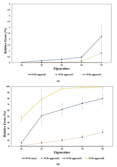 where n represents the number of input matrices (. The goal is to find the MRE for each eigenvalue. Five eigenvalues are generated from the SVD; therefore, the same procedure is applied for each eigenvalue from till .