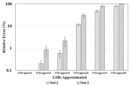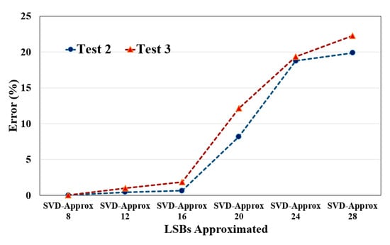 The error will increase when increasing the number of the approximated bits. Based on Test 1 presented in Section 4, simulations have shown that the MRE of the eigenvalues of the SVD (S1, S2, S3, and S4) remains lower than 1% after approximating 16 LSBs as is shown in Figure 11. While the MRE of the eigenvalues increases from 1% to 14.5% when approximating 20 LSBs. When approximating 24 and 28 LSBs, the MRE of the eigenvalues (S2, S3, S4, S5) increases drastically to more than 50%. From this simulation, we assume that 20 LSBs can be approximated. Figure 12 shows the MRE of approximate SVD after simulating test 2 and test 3, presented in Section 4. The MRE (SVD-approx8, SVD-approx12, and SVD-approx16) remains less than 5% for both tests. The MRE of SVD-approx20 is 11%, while in the worst cases, the MRE increases by up to 30% based on test 3. The MRE of SVD-approx24 and SVD-approx28 reaches values far from being acceptable (more than 50%) for both tests. From these simulations, we may conclude that ACTs are applicable for the SVD showing an increment of the MRE by less than 11%. In the following, we evaluate the performance of the approximate SVD in terms of power/energy consumption, time latency, and LUT usage. Figure 13 indicates the performance analysis of the SVD in terms of LUT and power/energy.