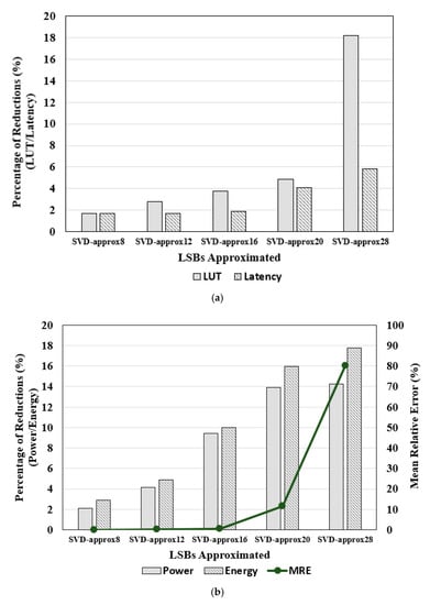 In Figure 13a, the x-axis represents the numbers of output LSBs approximated in the SVD and the y-axis represents, respectively, the percentage of reduction of LUT and latency. The power/energy consumption concerning the exact SVD is shown in Figure 13b. y-axis denotes the MRE of the outputs generated from test 2, indicating the range of acceptable accuracy. Based on these experiments, we notice that the power/energy consumption, LUT utilization, latency have been reduced when increasing the number of approximated LSBs. For instance, when approximating 20 LSBs, the LUT utilization and latency have been improved by more than 4%. The power and the energy consumption have been reduced respectively by up to 14 and 16% after approximating 20 LSBs with an MRE of less than 11%.