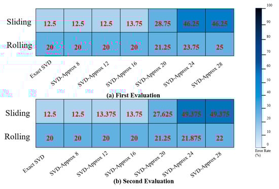 In this section, the values of the MRE generated from the second and the third tests presented in Section 5.2 are added to the simulation program of the tensorial SVM [4]. Figure 14 shows the results of the classification problem (sliding a finger vs. rolling a washer). For each test, the Err value of the SVM has been reported after increasing the number of approximate LSBs in the SVD from 8 to 28 bits. The simulation with the exact SVD shows an Err value of 12.5% for sliding and 20% for rolling. Such values have been assumed as a baseline to assess the impact of approximate SVD. Figure 14a shows that the Err value for sliding and rolling does not increase when employing SVD-approx8 and SVD-approx12. In the case of SVD-approx16, the Err value for sliding increases by 1.25%; while with SVD-approx20 the Err value reaches 28.75% for sliding and 21.25% for rolling. The Err reaches values far from being acceptable such as 46.25% when using SVD-appox24 and SVD-approx28 for sliding. Based on the third test, Figure 14b shows that the Err value for sliding increases by not more than 2% in the case of SVD-approx12 and SVD-approx20 concerning the Err value shown in Figure 14a. The Err value for sliding and rolling is fairly constant to the Err resulting in the second test in the case of SVD-approx8 and SVD-approx16. The Err in Figure 14b is expected to be higher than the Err in Figure 14a; since in the third test, only the highest RE from the eigenvalues is taken into consideration.