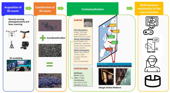 The proposed approach has been developed in the context of the Mingei European project [36,37], which aims at representing and making accessible both tangible and intangible aspects of crafts as CH [38]. It is a stepwise approach as illustrated in Figure 1 and initiates with the acquisition of 3D data that capture the appearance of spatial and geographical context through the reconstruction of geographical terrain from remote sensing, 3D reconstruction of architectural structures from 3D scanning, and 3D modeling. The next step is the combination of 3D assets to synthesize representations that provide information on the past state of sites that are not anymore available, due to changes in landscape or destruction of architectural structures. Next, the utilized digital assets are semantically annotated to link information on the social and historical context of the site. In the last step, the wealth of information achieved through this authoring process is employed to provide new opportunities for the exploitation of knowledge, using digital presentation modalities media that support education and tourism. The use cases highlight the benefits of the proposed approach. The aforementioned approach is visually summarized.