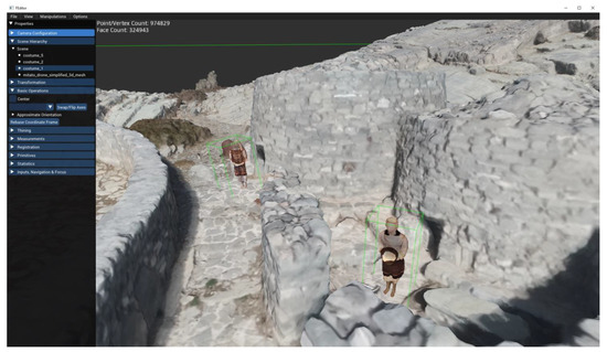 In this work, ICombine3D is used to combine reconstructions from multiple scanning modalities. To do so, through the editor these modalities are registered in the same spatial frame. In this way, we provide multiple types of information on the same spatial reference; i.e., a site or an object. In the case of sites, we use also the GIS capabilities of our system to properly reference the provided digitization and avail their integration by 3rd party systems. Furthermore, using the editor we created simulated environments, e.g., craft workshop simulations. An example of combining 3D assets using the aforementioned editor is presented in Figure 4.