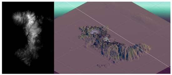 For the generation of the Chios terrain, the heightmap of the island was obtained from [44]. This map was imported into a 3D engine, in the form of a 3D mesh. The process included editing resolution, terrain size, and maximum altitude, in conjunction with the elevation data and the size of the 3D reconstructions of villages and the museum. Then, the terrain was post-processed using two different methods.
