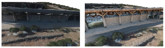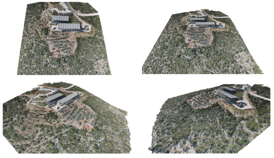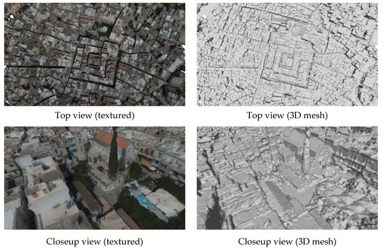 For the reconstruction of the Chios villages, aerial images were acquired via an unmanned aerial vehicle (UAV). The subjects were large building complexes. The built structures were challenging, due to the complex, medieval city planning and fortification. We observe that building structures are reconstructed with fidelity and the narrow alleys, streets, and village squares are clearly outlined and allow the spatial planning of field operations (see Figure 7).