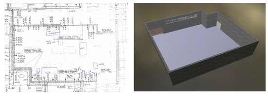 The workshop building was initially created in Unity based on a blueprint acquired from CERFAV (see Figure 11 left). Unfortunately, the scale was not included, therefore the first draft of the building was created based on the proportions from the survey. To create a more realistic version of this pilot, Unity’s High-Definition Rendering Pipeline (HDRP) was researched and used. Due to the change in definition, the workshop building from the previous iteration had to be re-modeled to match the quality intended. The new model was also scale corrected since the initial model was based on an electrosurgical survey which had no scale or reference for actual measurements. More so, re-modeling was taken a step further, to create space in the wall for windows, including the window frame and glass geometry. UV maps and materials were created for all of the building’s geometry. Configurations for exporting from Blender and importing to Unity were also defined for a straightforward result.