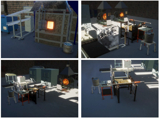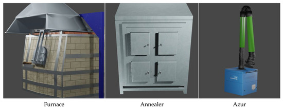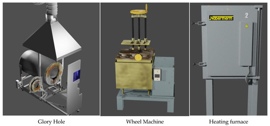 The machines of the workshop were created from scratch in Blender 3D using photographic documentation acquired during a visit to CERFAV in the context of ethnographic documentation activities of the glass-making craft. Examples of the documentation are presented in Figure 12. Examples of modeled machinery are presented in Figure 13.