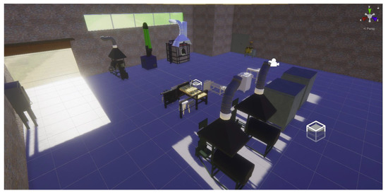 Having set an environment, there is enough ambient light to start placing the machines in the workshop. Existing machinery is placed approximately in the places of the photographic material as shown in Figure 14.