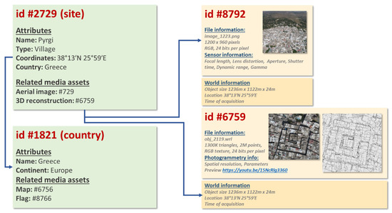 The contextualization of spatial and geographical content is implemented using the MOP. When creating a “Location” we use the GeoNames [49] database of locations to link the name with its GPS coordinates. Moreover, the 3D assets are uploaded to the platform and associated with the location entry. The data structure corresponding to the aforementioned process is shown in Figure 15.