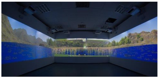 Airborne is an immersive flight simulator that runs in a large 3D space, consisting of three touch-enabled walls, supports people tracking, and body-based interactions (see Figure 17). A total of six projectors EPSON EB-696Ui are used for the whole setup, hanging from the ceiling, at 2.80 m from the floor. Each pair of projectors spans the total length of each wall and the majority of its height (~1.60 m) at a resolution of 3840 × 1200 creating an ultra-wide (11520 × 1200 px) display for fully immersive visual outputs. Each projector is equipped with a touch sensor unit for enabling touch interaction on the walls. Moreover, stereo speakers are integrated into each projector to allow audio playback.