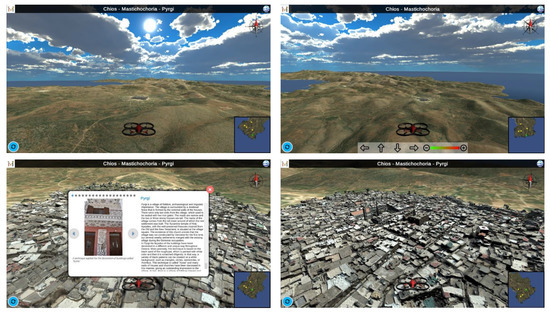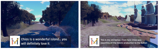 For demonstration purposes, a scenario was created and recorded following the path of a user from game start until the discovery of two main points of interest (a) the mastic field and (b) the village of Olympoi to experience its architecture. A video demonstration can be found online at https://youtu.be/fsEgKhMydJw (accessed on 10 October 2021) while some screenshots from the gameplay are presented in Figure 20.
