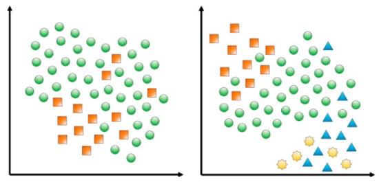 Two possible class imbalance scenarios: (left) binary imbalanced problem and (right) multi-class imbalanced problem [36].