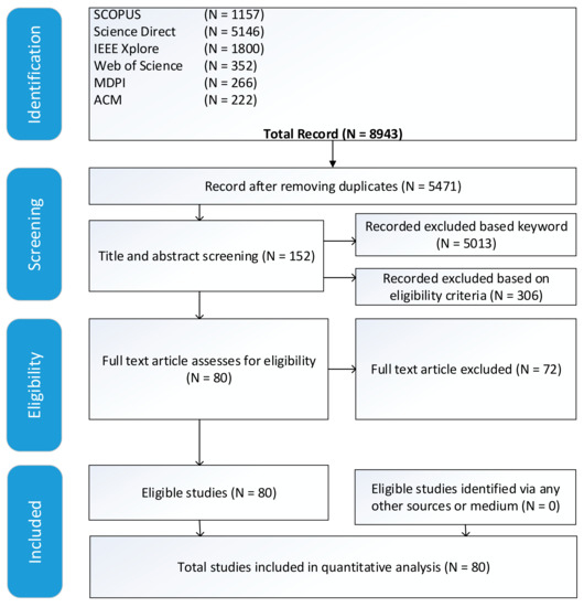 The literature search was performed using different database sources based on a search strategy developed to identify the relevant studies. To this end, a systematic computerized search was finalized using three database sources, namely SCOPUS, Science Direct, IEEE Xplore, Web of Science, ACM, and MDPI. We developed a search strategy to identify relevant literature following the Preferred Reporting Items for Systematic Reviews and Meta-Analyses (PRISMA) guidelines during all stages [55]. Figure 2 presents the article screening and selection processes which were assessed by two authors of this study (M.A. and Y.B.).
