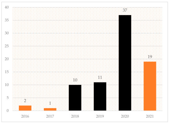 Figure 3 depicts the yearly distribution of the studies from 2016 to 2021. It was observed that the number of studies has significantly increased over the years, which signifies that the field of cybersecurity and IoT are gaining in popularity and receiving increasing attention from various scholars. The findings also indicate that AI models have produced satisfactory results in detecting IoT cybersecurity threats. As seen in Figure 3, the highest number of studies were published in 2020 (N = 29, 52.7%), followed by 2019 (N = 11, 20%).
