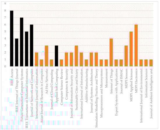 Figure 4 illustrates the distribution of our search results by journal sources, including IEEE Access, IEEE Internet of Things Journal, Future Generation Computer Systems, IEEE Transactions on Industrial Informatics, Journal of Network and Computer Applications, International Journal of Information Management, Ad Hoc Networks, Asian Journal of Research in Computer Science, Journal of Cloud Computing, Applied Soft Computing, Computers & Security, Computer Science Review, Journal of Information Security and Applications, Sustainable Cities and Society, International Journal of Information Security, Enterprise Information Systems, Additive Manufacturing, Journal of Systems Architecture, Simulation Modelling Practice and Theory, Measurement, Microprocessors and Microsystems, Internet of Things, Expert Systems with Applications, Journal of ISMAC, MPDI Sensors, MPDI Electronics, MDPI Applied Sciences, International Journal of Environmental Research, Information Sciences and Public Health, and Journal of Ambient Intelligence and Humanized Computing. This result shows that the studies are obtained from respected scholarly journals.
